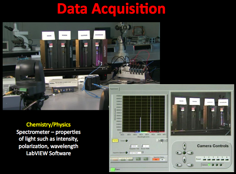 In the image above (you can click on all images to make them bigger) we see a setup for a chemistry or physics experiment using a spectrometer to analyse properties of light. The photo at the top shows a pan/tilt camera in the lower left providing a view of the gas filled tubes shown in the student screen shot view in the bottom right. A small inspection camera at the end of the blue cable in the photo is mounted on a linear table that can move left and right in front of the gas tubes. Students use linear table controls to physically manipulate the position of the inspection camera in front of one of the gas tubes and fire the tube which then emits a light. The blue cable feeds the image of that light from the inspection camera to the spectrometer box where data on the intensity and wavelength of the light source are processed and displayed graphically, as is seen on the left panel of the student screen shot view. Students can download both the raw data and the graph to their own computers for more detailed analysis (determination of what gas is in the tube for example) and inclusion in their lab reports.